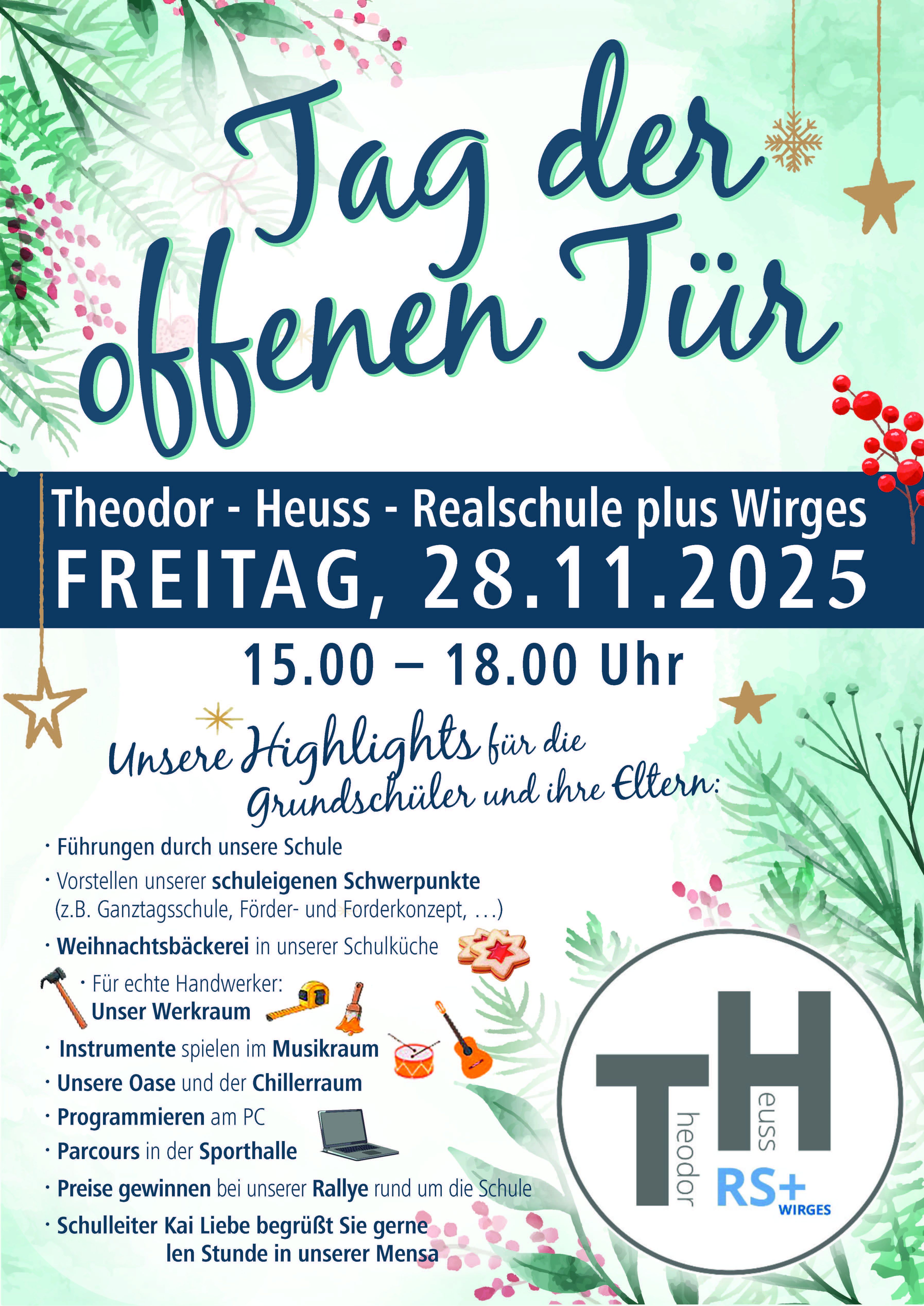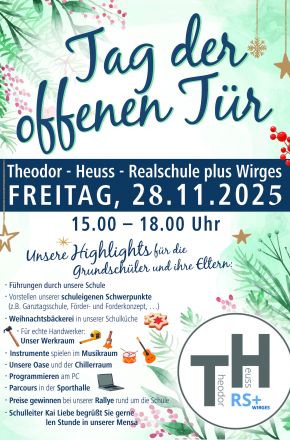 - Dienstag, 25.11.2025, Mittwoch, 26.11.2025 und Donnerstag, 27.11.2025 finden die SCHNUPPERTAGE für die Grundschulen in der Verbandsgemeinde Wirges statt, zu denen wir die Viertklässler sowie deren Klassenleitungen herzlich eingeladen haben:
