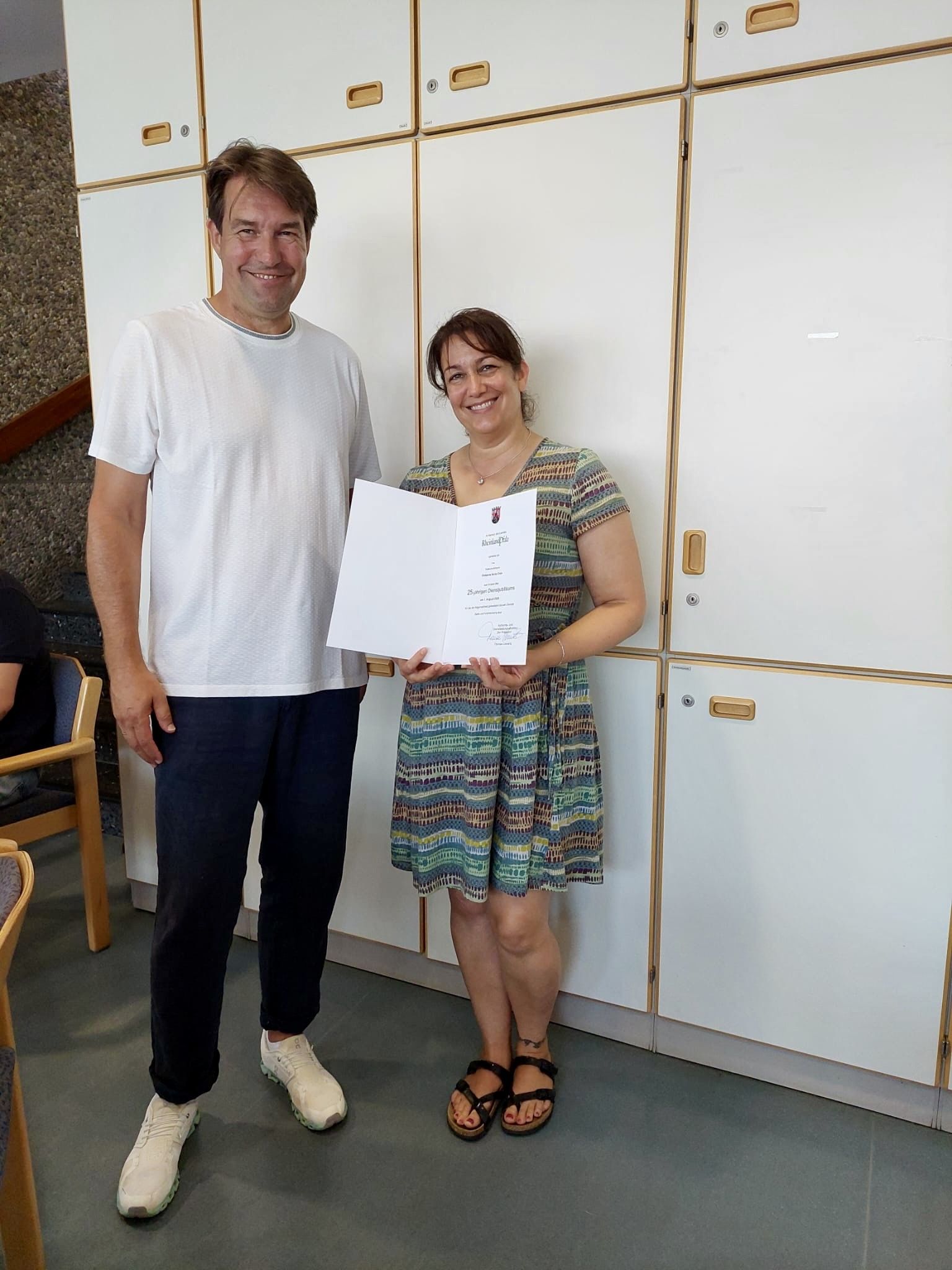 Im Namen des Präsidenten Thomas Linnertz überreichte Schulleiter Liebe der Lehrerin an einer Realschule plus Ute Neust zum 25-jährigen Dienstjubiläum ihre Urkunde und sprach ihr für die der Allgemeinheit geleisteten treuen Dienste Dank und Anerkennung aus.
