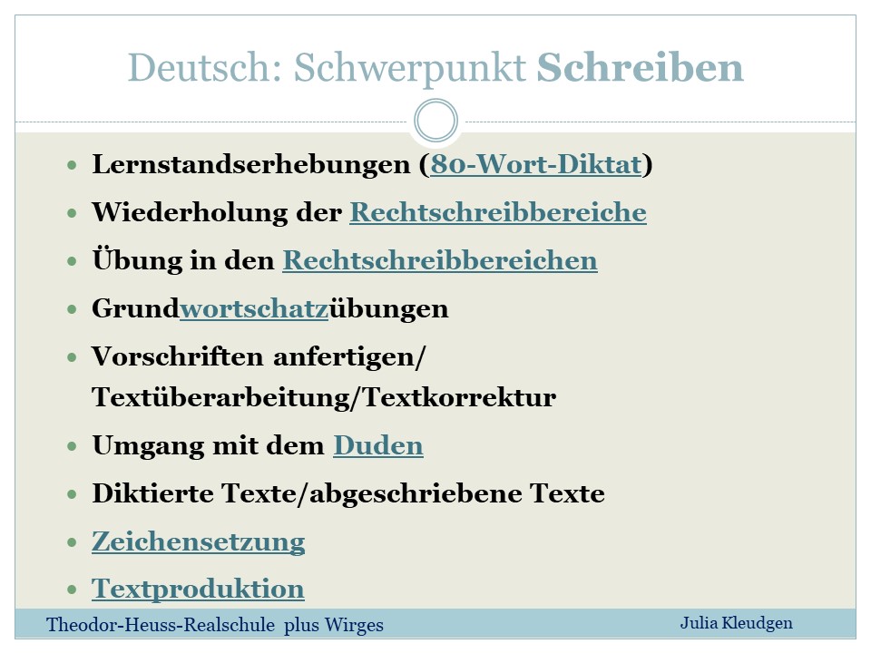 - 2 Stunden pro Woche (1 Stunde mit Schwerpunkt "Schreiben", 1 Stunde mit Schwerpunkt "Lesen")
